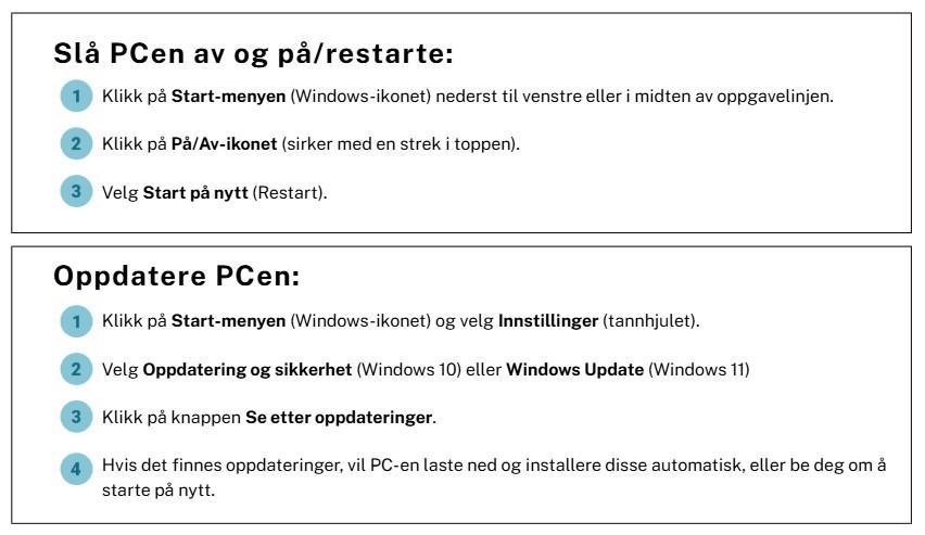 Før du skal ha prøve eller skriveøkt med stengt nett, er det viktig at PC-en din er helt klar. Her får du en kort og tydelig oppskrift som sikrer at du unngår tekniske problemer – fra lagring og restart til hva du må gjøre før, under og etter prøven.